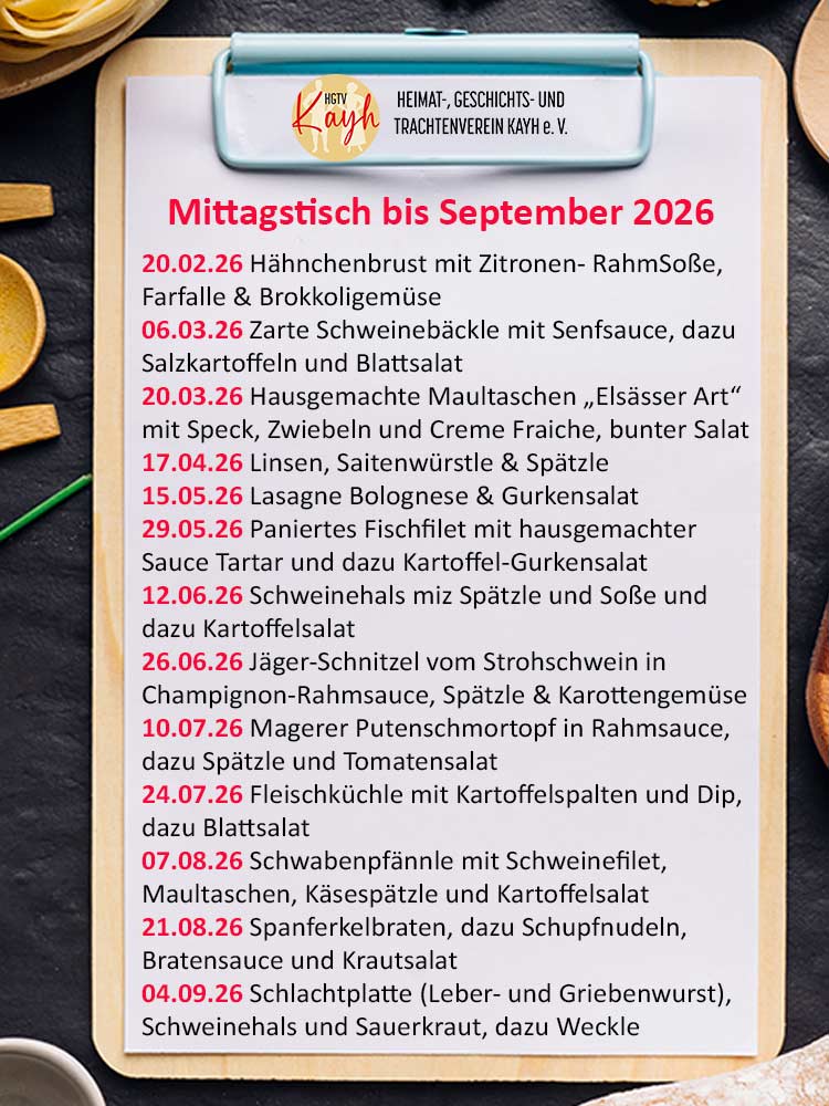 Der Kayher Mittagstisch findet jeden Monat und zweiten Freitag von 12:00 bis 13:45 Uhr im Evangelischen Gemeindehaus Kayh, in der Herrenberger Straße 10, statt (Wegbeschreibung). Der Mittagstisch in Kayh ist eine Aktion von unserem Heimat-, Geschichts- und Trachtenverein Kayh e. V., in Kooperation mit der Evangelischen Kirchengemeinde Kayh-Mönchberg.